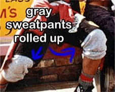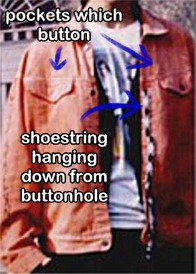 Ted also wears a red jacket. The actual color is somewhere between an orange and a rust, but it sometimes comes across as being reddish so anything in that realm of the color spectrum will do. The jacket should be either a jean or denim fabric or something similar. Ted usually keeps this wrapped around his waist, the same way Bill keeps his shirt around his waist. If you do wear the jacket you should add a couple of touches. One is to put a black and white colored shoestring through one of the buttonholes of the jacket and let it dangle down. See photo below to see how this should look.