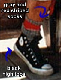 Ted wears gray tube socks with a thick red stripe near the