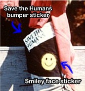 On to the shorts! Ted wears black shorts which come down to just above his knee. These can be very plain, simple black shorts and shouldn't be too hard to find. However, Ted has added a couple of things to his shorts. On the left leg (when worn) he has a bumper sticker which reads "Save the Humans" and then below that a Smiley face sticker. You should be able to find a smiley face icon somewhere to use, or draw one yourself. As for the bumper sticker, I found several for sale on eBay. A photo of the sticker itself can be found below so you can see what it looks like. Refer to the photo below that one to to see how these should be placed.