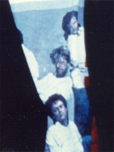 We'll start with Ted's shirt. Ted wears a white t-shirt which bears a promotional photo of the band Van Halen used around the time of their album "5150." The photo shows the band (with Sammy Hagar) strapped into straitjackets. It may be difficult to track down this particular shot for use on your shirt, but here's a copy I found on a pin for sale on eBay which features the correct photo. Compare it to the section of the picture showing on Ted's shirt: