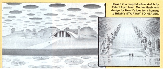 The bigger scale of BILL AND TED GO TO HELL results in part from the need to depict Matheson and Solomon?s fanciful settings, which include Heaven as well as Hell, a lure for Hewitt on the project. "A lot of my favorite films involve Heaven and Hell, ghosts and angels," said the director, citing Frank Capra?s IT?S A WONDERFUL LIFE and Michael Powell?s STAIRWAY TO HEAVEN. "When Bill and Ted meet God, the staircase is straight out of that film," said Hewitt, "We?re going to include statues of [director] Michael Powell and [its star] David Niven."