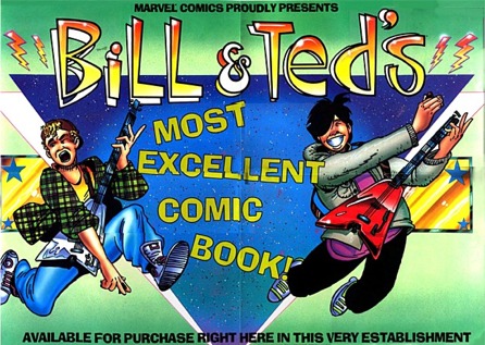 Bill and Ted's appeal reached people of all ages, from the very young to the very old. While kids probably enjoyed the colorful artwork and the exciting stories, the humor was geared more toward and adult audience. The zany storylines, made even funnier by the good-hearted reactions of Bill and Ted, followed the style of the original movies, while the plots took them though a wide variety of new and most excellent adventures. This inclusion of Evan's taste for oddball pop culture (The Planet of the Apes Movies) and hip bands (Red Hot Chili Peppers) added a depth not usually touched upon in most Marvel comics.