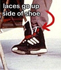 In Bogus Journey it's Bill whose wearing black high top sneakers. He accents these with red shoelaces which are tied rather loosely (in fact the laces are not tied on top, but laced only partway and then looped up through the shoelace hole along the side. See below for how this should look.
