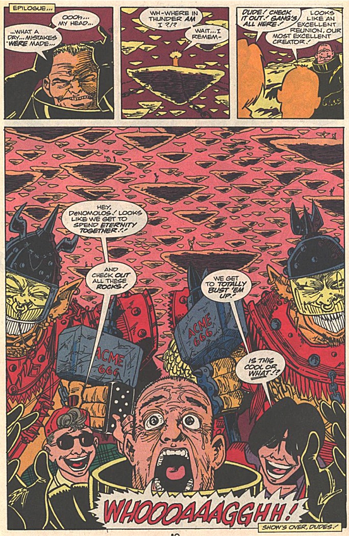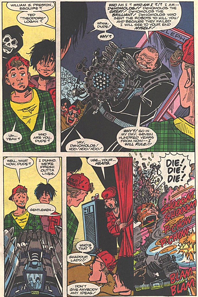 First of all, let's get one thing perfectly clear . . . after I tried to kill Bi . . . um . . . those Two Stupid Ones . . . at the Battle of the Bands, I was not simply carted off to jail as was depicted in that piece of film fabrication that was devised in 1991. The fact of the matter is . . . I DIED!!! And not only did I die, but I went to HELL! I was stuck on a rock with those two irritating robot replicas I built! If it weren't for my skills at the game of Life (and Death's lack of skill in any kind of board game other than chess) I never would have been able to return at all! The only one with the balls to chronicle this true history was a strange, nobody cartoonist named Evan Dork or something . . . I understand his only other notable work was about dairy products, so you see that drawing myself in cartoon form was undoubtedly the highlight of his career. I hear tell some other meaningless paperback also dared to tell the true tale of how I was unfairly and unjustly killed by those two supposedly peace loving nobodys. I present the following panels, drawn by the aforementioned loser cartoonist, as evidence of the untimely demise I suffered at the hands of those two fools!!
