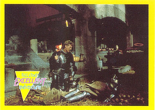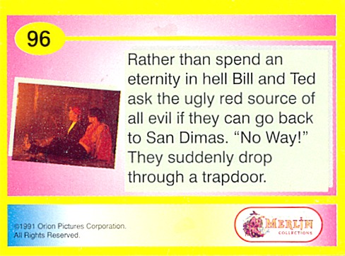 These trading cards were produced by Merlin in Britain only. The series of 130 cards covers both Excellent Adventure and Bogus Journey, half of the set covering each film. Terrific photos are used, as shown above. The backs of the cards simply followed the plotlines of the movies. General cards with promo shots from the movies included Bill & Ted terminology on the back.