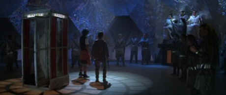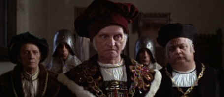 holding the phone booth and jump aboard as the King barks at his guards to take