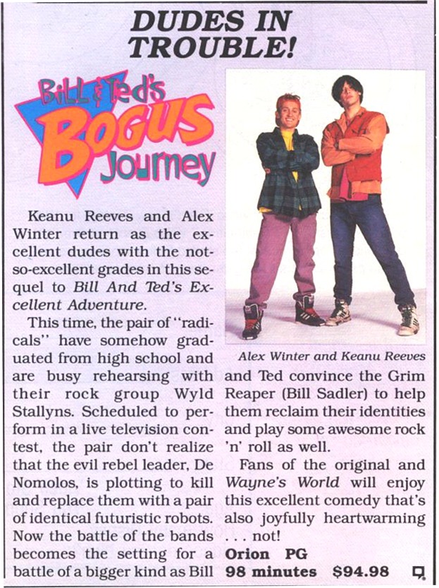 This short article about the videotape release of Bogus Journey is interesting for the fact that it remind us of the days when we used to have to pay almost $100 for one movie on VHS!! No way!!!!!