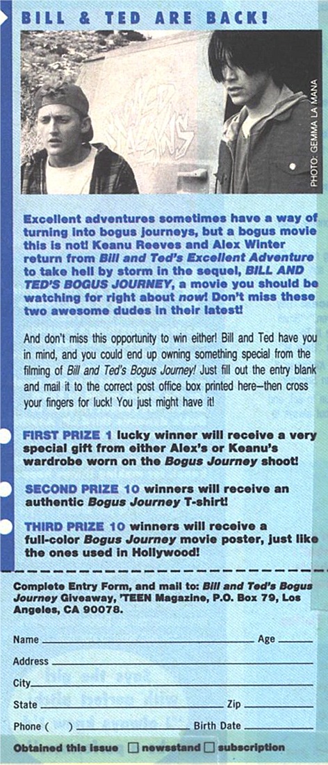 This contest was held by TEEN Magazine sometime in 1991 and also gave away some article of clothing from the movie! Again, we wonder which piece of clothing was given away!