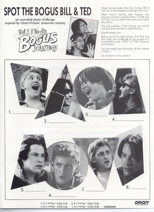 On the next page, you?ll find eight photos of what would appear to the naked eye to be Bill and Ted. But look closer. Because half the shots are actually Evil Bill and Evil Ted -- which means that contestants must somehow determine who?s who.