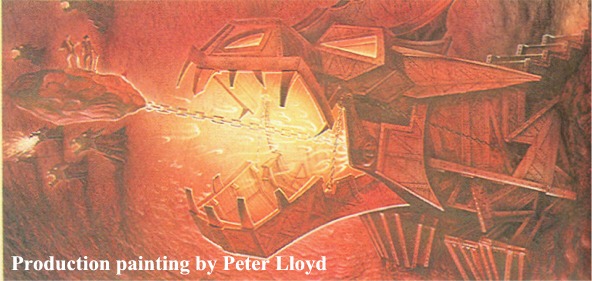 Bill and Ted perched atop, will be drawn by a chain toward the flaming mouth of