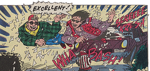 Evan: Yeah, I know what it?s like to be into something that a lot of people forgot about. Some of the music I like and stuff . . . it just skates along, it?s not a big industry. I think I really did my best on the thing and I really had a free hand. I improvised last minute a lot of the pages and stuff. There will be a Fight Man spin-off even though it?s not Bill and Ted, so what I?m thinking of doing is I?ll have to stick Bill and Ted in a panel somewhere to sc*** (the license holders), man, because they were just really cheap about certain plots. Like Issue 11 was supposed to be very different, I don?t think it?s been out yet ? the Lincoln issue. And it just kind of got washed out.