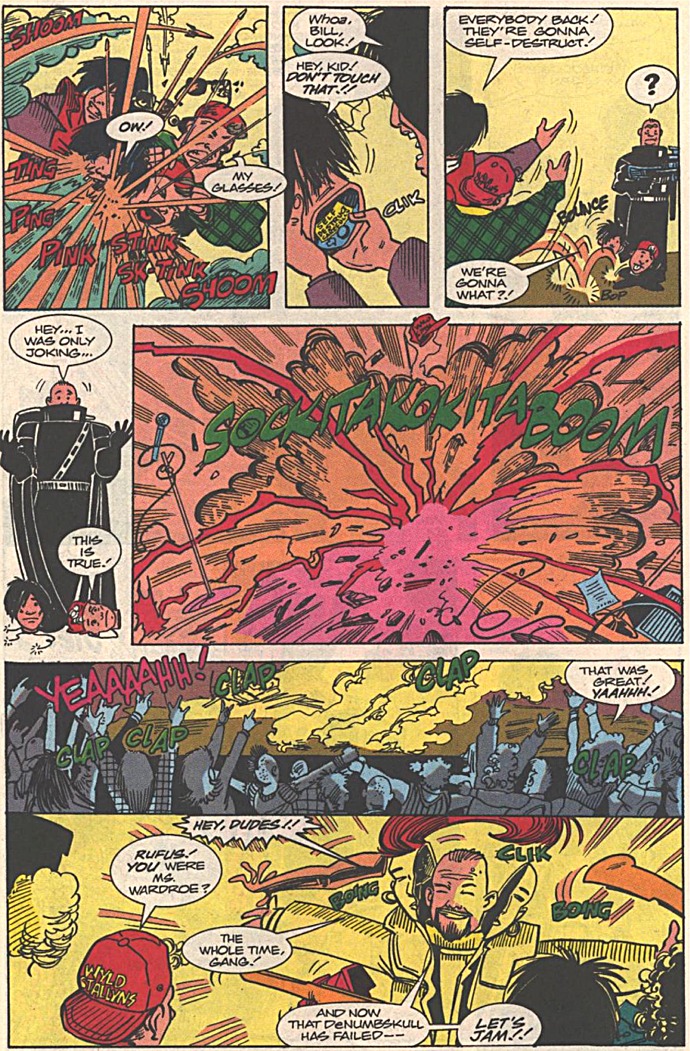 First of all, let's get one thing perfectly clear . . . after I tried to kill Bi . . . um . . . those Two Stupid Ones . . . at the Battle of the Bands, I was not simply carted off to jail as was depicted in that piece of film fabrication that was devised in 1991. The fact of the matter is . . . I DIED!!! And not only did I die, but I went to HELL! I was stuck on a rock with those two irritating robot replicas I built! If it weren't for my skills at the game of Life (and Death's lack of skill in any kind of board game other than chess) I never would have been able to return at all! The only one with the balls to chronicle this true history was a strange, nobody cartoonist named Evan Dork or something . . . I understand his only other notable work was about dairy products, so you see that drawing myself in cartoon form was undoubtedly the highlight of his career. I hear tell some other meaningless paperback also dared to tell the true tale of how I was unfairly and unjustly killed by those two supposedly peace loving nobodys. I present the following panels, drawn by the aforementioned loser cartoonist, as evidence of the untimely demise I suffered at the hands of those two fools!!