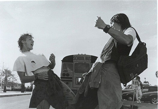 We believe a few scenes from the original script were actually filmed for the original cut of Excellent Adventure. These scenes show Bill and Ted arriving at school in the bus and greeting the popular kids (Biff and Ox included) only to be told they are cretins (they proclaim this "Excellent!", thinking it's a compliment). Later Bill and Ted attempt to ask two popular girls to the prom (flyers for the prom can be seen stuck to the lockers in the photos above) and are turned down.
