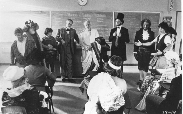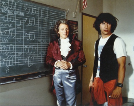 The famous final report was originally filmed to take place in the classroom. The four popular students presented a dramatization dressed as historical figures themselves (you can see them sitting with their backs to the camera in the third photo above). Beethoven apparently writes out some of his music on the chalkboard and Ted stands in front of the chalkboard which has been divided up into "Excellent" and "Bogus" sections, the historical figures having picked items for each category (girls, baseball bats, escalators, waterslides and a Nerf football making the excellent list; jail, police cars, bowling, old fashioned clubs and an iron maiden making the bogus list). It was eventually decided the film needed a more climactic ending and the oral reports were moved to the auditorium where Bill and Ted could put on a real flashy presentation.