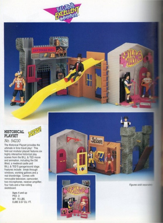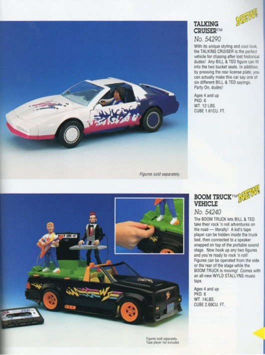 The bodacious Dr. Kent dude provided us with these images from the Kenner Toy Fair catalogue when the Bill & Ted toys were first offered up to buyers. These have really good photos of the items which were never made available for sale! Most interesting is a talking cruiser which we've never seen mentioned before (according to Dr. Kent, this was simply a refurbished Knight Rider car!) There's also a much better look at the medieval playset! We totally appreciate these pics!