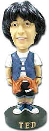 Head Knockers and Bobble Head figures have recently seen a HUGE resurgence in popularity, and companies like NECA are quick to make available the most funky, fashionable and popular characters in this unique format, so we should be wildly happy that none other than our own Ted "Theodore" Logan has been thus immortalized in Head Knocker fashion. Based on Ted from Excellent Adventure, this figure is made completely of painted resin and comes in a box which features the Two Great Ones on their phone booth. We're not sure just how long this has been out on the market, but yours truly has seen it for sale in Suncoast for some time!