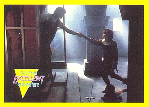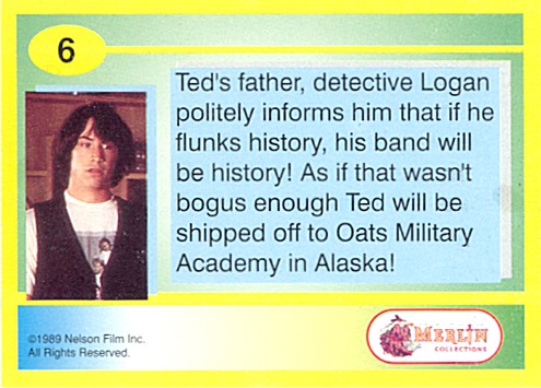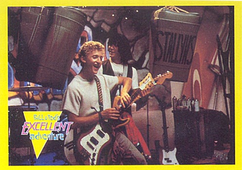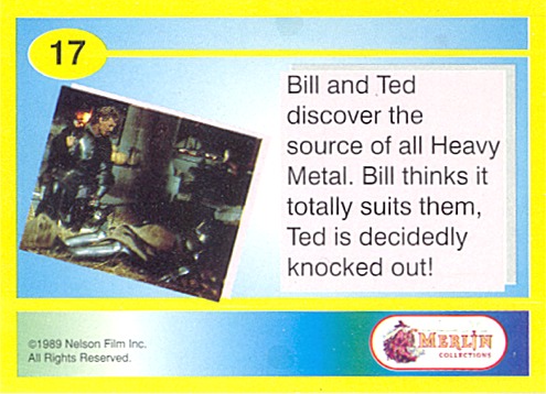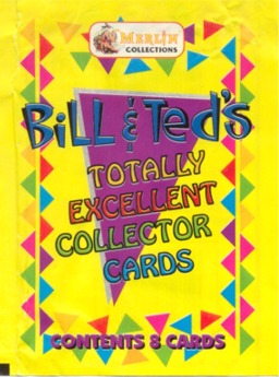 These trading cards were produced by Merlin in Britain only. The series of 130 cards covers both Excellent Adventure and Bogus Journey, half of the set covering each film. Terrific photos are used, as shown above. The backs of the cards simply followed the plotlines of the movies. General cards with promo shots from the movies included Bill & Ted terminology on the back.
