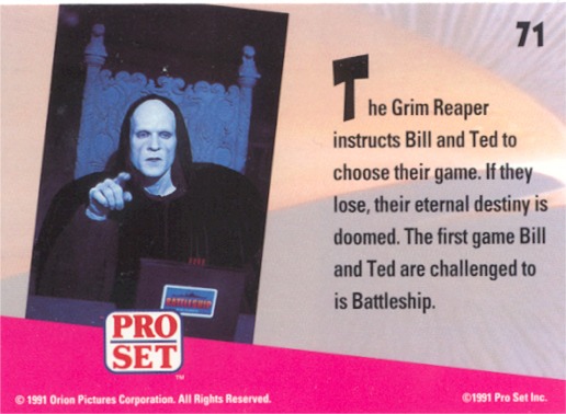 Pro Set's Trading Cards came in packs of 10 and collectors could compile a complete set of 100 cards promoting both Excellent Adventure and Bogus Journey. Pro-Set is one of the leaders in the trading card world and they did a most excellent job on this set, using pleasing colors, great photos and telling the stories of both movies on the back in a fun way. Also the use of *different* photos on the back was a nice decision, meaning fans would get around 200 different photos with this set! A scratcher card contest (with scratcher cards included in every pack) offered fans the chance of winning a trip to San Dimas, a GTE Telephone Booth or smaller prizes such as Bill & Ted Nintendo Game, Game Boy Game or T-shirts.