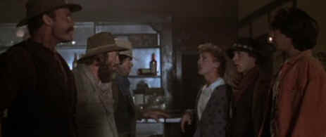Billy into the booth as the angry saloon patrons run at them. "Don?t