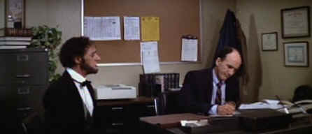DUCK!" They duck behind the desk as a man leaves his desk across the